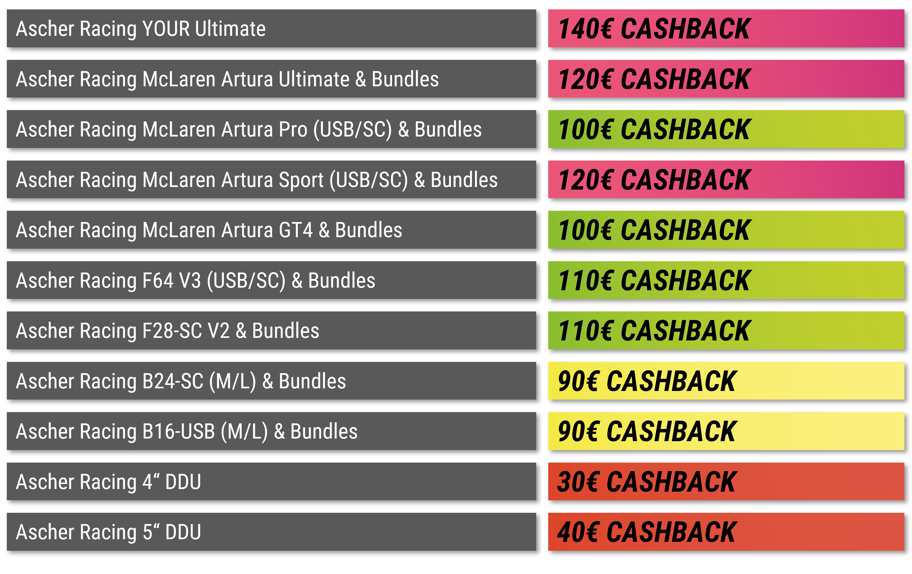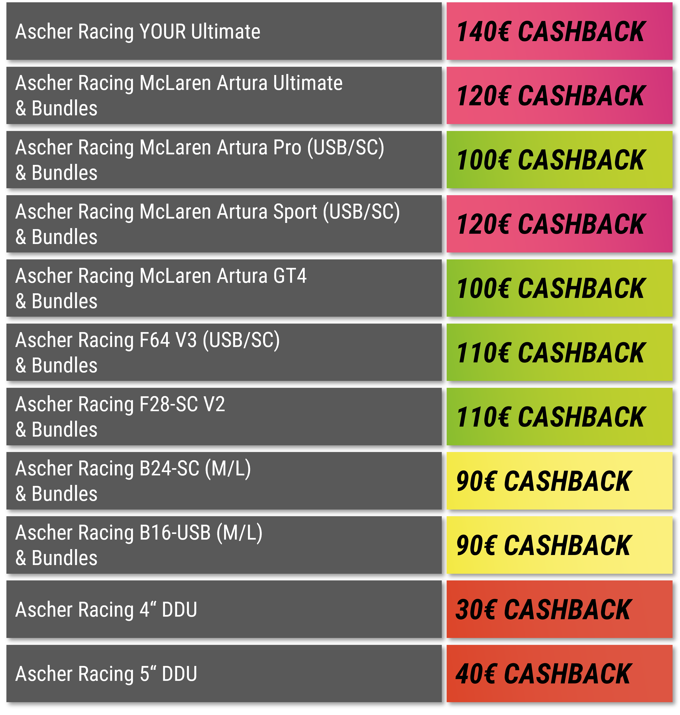 03. Der Kunde erhält den folgenden Cashback/die folgende Rückerstattung für das Ascher Racing-Lenkrad oder das Dashboard, das innerhalb des Aktionszeitraums bei einem offiziellen Ascher Racing-Händler oder in unserem offiziellen Ascher Racing-Webshop gekauft wurde: